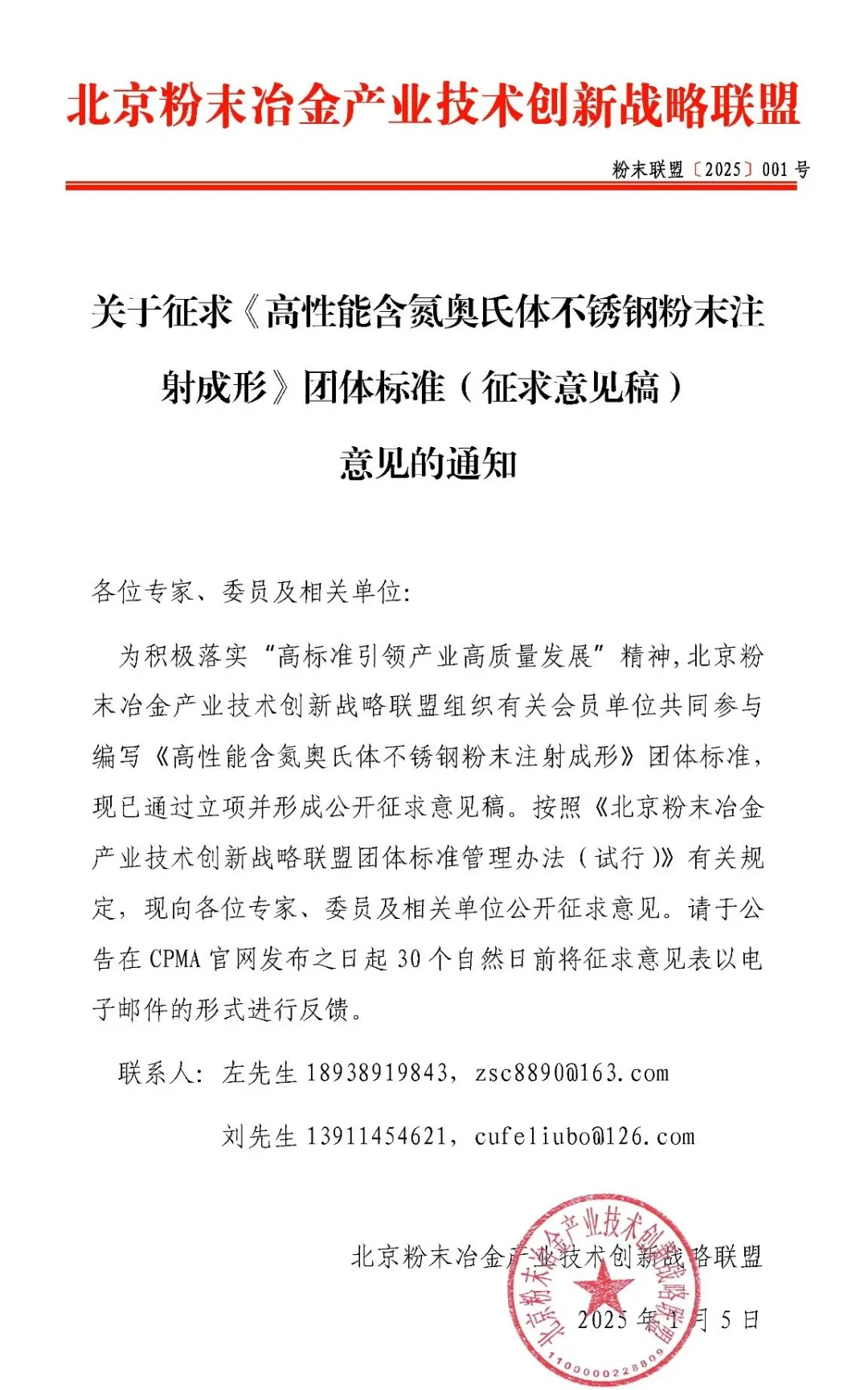 按照《北京粉末冶金產(chǎn)業(yè)技術(shù)創(chuàng)新戰(zhàn)略聯(lián)盟團(tuán)體標(biāo)準(zhǔn)管理辦法(試行)》有關(guān)規(guī)定,現(xiàn)向各位專(zhuān)家、委員及相關(guān)單位公開(kāi)征求意見(jiàn)。